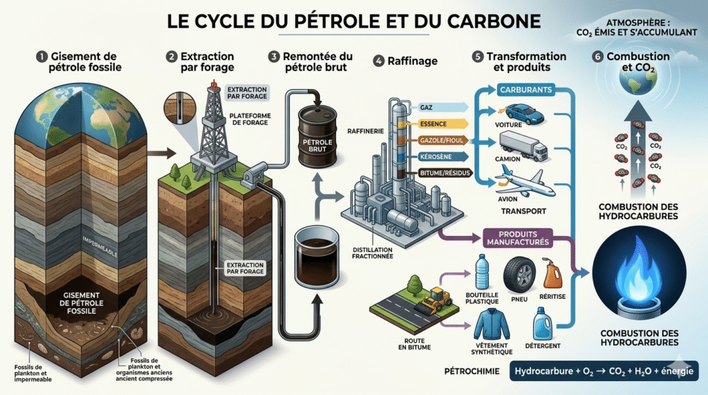 Le pétrole ne sert pas seulement à faire avancer les voitures. Après raffinage, il permet de produire des carburants comme l’essence, le diesel ou le kérosène, mais aussi de nombreux objets du quotidien : plastiques, emballages, pneus, peintures, détergents, fibres synthétiques, bitume…